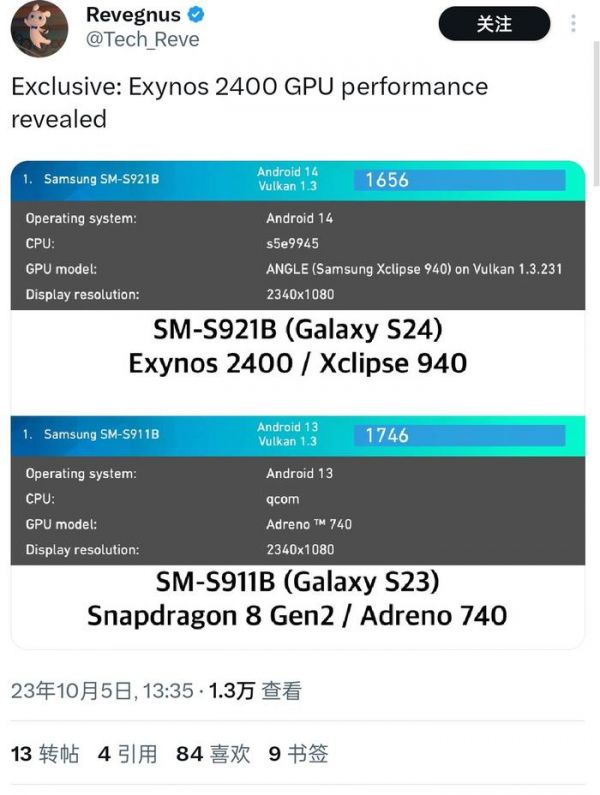 三星Exynos 2400芯片GPU跑分曝光,略低于骁龙8Gen2