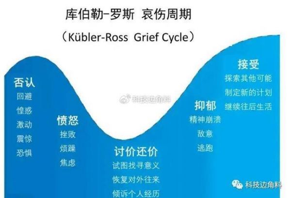 1969年,美籍心理学家Elisabeth Kübler-Ross在其《论临终与死亡(On Death and Dying)》一书中,将人类在面对重大灾难时的哀伤,划分为5个阶段(DABDA):