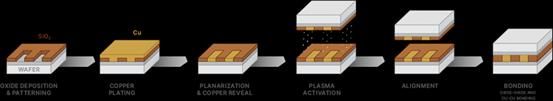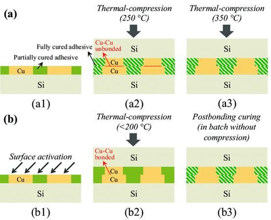 它验证了低温直接键合(Direct Bond Interconnection, DBI)的可行性,首先准备好晶片具有SiO 2(介电材料)与铜(接点金属),此时铜部分将会有点略低于介电材料厚度,利用电浆(Plasma)做表面活化处理,将晶片面对面在室温下进行对位接合,由于凡德瓦力作用已具有一定的接合强度,接着在100℃ 下持温让SiO 2与SiO 2之间进行缩合反应,形成强力共价键提高接合强度 。接着再将温度提高到300℃ 至400℃ 持温,此时由于铜金属的热膨胀系数较SiO 2来的大,铜表面将会碰触在一起,并自然受到一压应力,促使铜接点进行扩散接合。