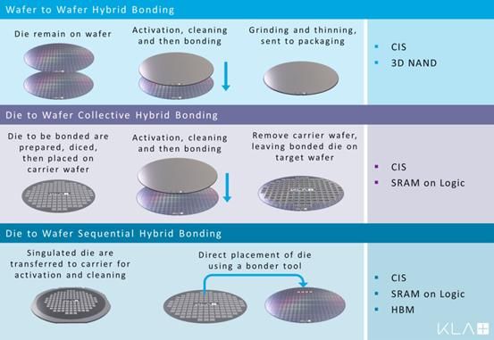 其中,W2W 虽然已经实现量产,但它对于上下芯片的大小限制须为一样大小,否则将有区域浪费;D2W是将切割好的Die用临时键合的方式粘到晶圆上,然后整片地和另一片产品晶圆整片键合再解键,这项技术容易累计误差,且成本高,对Die的厚度变化范围也有较高要求;C2W将切好的Die分别放置晶圆的对应位置上,位置精度虽然提高且厚度变化要求不在严苛,但颗粒控制也是影响它继续普及的问题。