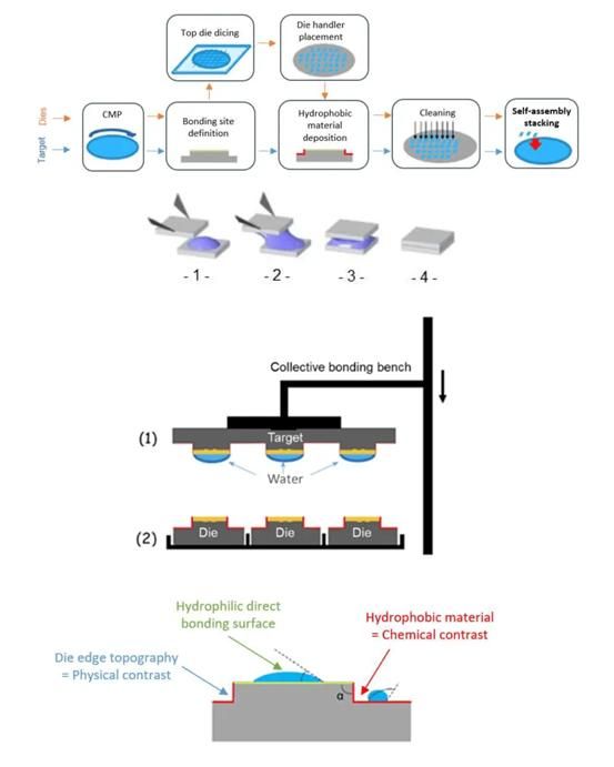 此外,2002年6月,CEA-Leti 和英特尔宣布了一种全新的混合键合自对准工艺,使用水滴的毛细力(capillary forces)来对齐目标wafer上的die,该工艺有可能增加校准精度以及每小时数千个芯片的制造吞吐量,采用取放工具后键合的最先进的对准是 1µm,最好的情况是 700nm,而新工艺提供低于 500nm 甚至小于 200nm 的后键合对准。
