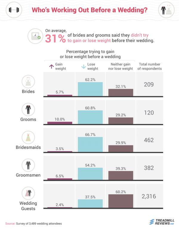 一项3500人参与的调研显示,近70%的新娘新郎在婚礼前会进行突击训练,表现出最好状态,甚至有超过60%以上的伴娘伴郎也会进行体重管理。