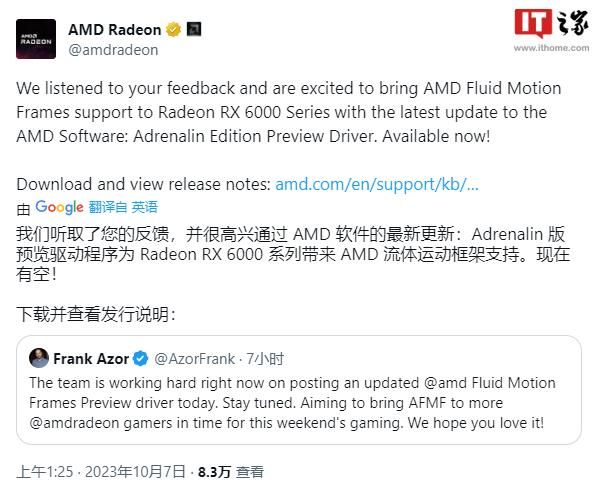 IT之家 10 月 7 日消息,AMD 今日发布了一个新的 Adrenalin Edition 预览驱动程序,为 RX 6000 系列显卡启用了 AMD Fluid Motion Frames(AFMF)帧生成技术支持,该技术最初仅支持 RX 7000 系列显卡,但在旧款 AMD 显卡用户的强烈要求之后,该公司将 AFMF 向下兼容到了上一代显卡。