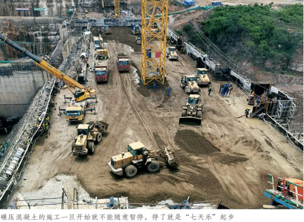 大坝的碾压混凝土浇筑刚刚迎来了一次暂时的收盘。连续59天,大坝从94.8米一口气上升到了136米,连续上升了41.2米。简单来说,就是我们站的这个位置从平视升到了仰望60度。我们一致认为,这41.2米大概率应该是个世界纪录,因为网上能够查到的连续上升记录只有三十多米。此前从来没有人申报过这样的世界纪录,所以我们决定——也不申报。