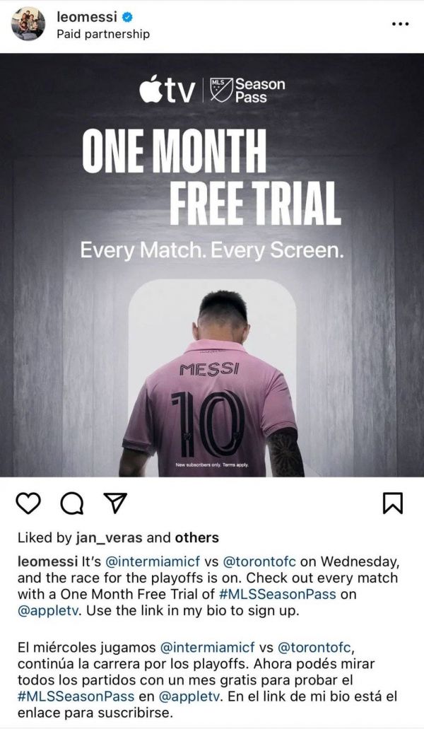 梅西在社交账户上推广 Apple TV 的 MSL 季票 |Instagram