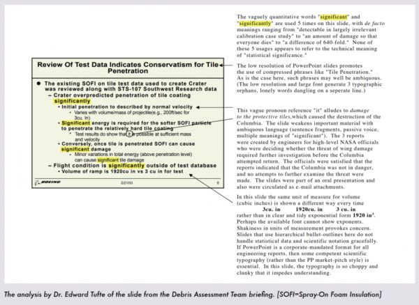在这之后,耶鲁大学的统计学家爱德华·塔夫特在分析事故的原因时指出,其实早在1月NASA 高级管理人员就获得了一张PPT,上面写明了绝热材料碎片脱落造成的损坏。然而,由于PPT排版太烂,这条危险的信息隐藏在一大块文本框里,没有引起工作人员的注意。