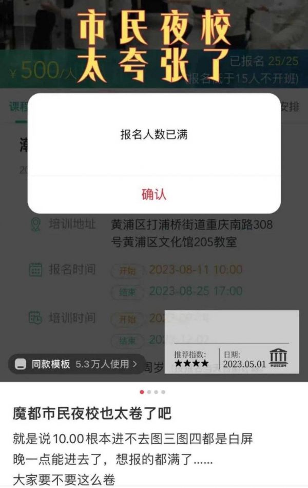 想要抢到一个夜校的名额太难了,在“上海市群众艺术馆”公众号开放秋季班报名的时候,连页面都刷新不出来,“一进去你会发现冷门的课程都是瞬间秒没,想抢到要提前关掉所有app,飞行模式重启后一次次地刷。”