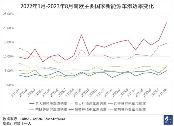 南欧因为新能源车的渗透率还偏低,只有葡萄牙超过20%,意大利和西班牙还在10%徘徊,所以纯电和插混车型还在同步增长,不过在渗透率最高的葡萄牙,已经出现类似西欧市场的纯电增长高于插混的趋势。