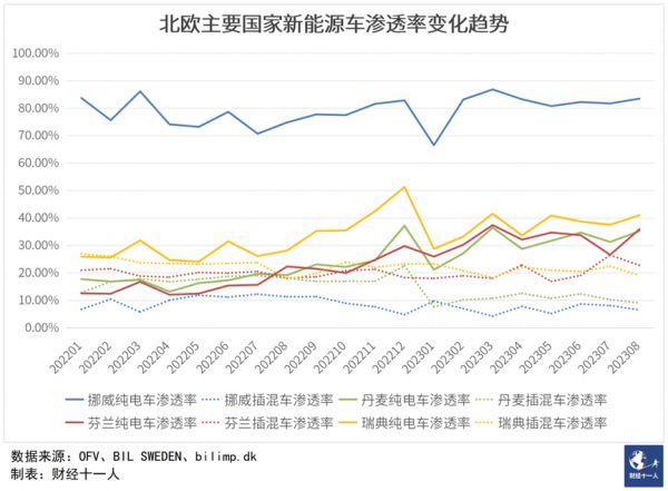 北欧是当前欧洲乃至全球新能源车渗透率最高的区域,挪威的新能源车渗透率已达90%左右,瑞典超过50%,丹麦、芬兰也超过30%,渗透率越高的国家,纯电超出插混的幅度越大,挪威达到10倍左右。