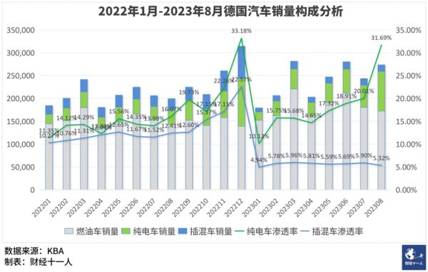 但进入2023年后,插混车型销量瞬间停滞,渗透率一直徘徊在5%左右,纯电车型保持高速增长,2023年8月,德国纯电车型的渗透率比去年同期增长近一倍,销量增幅170.73%。