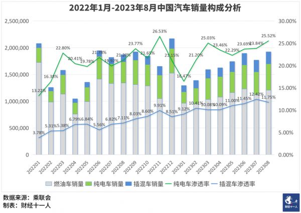根据欧洲主要十二个汽车市场的销量统计,2022年全年插混车型在欧洲整体销量中的占比(渗透率)还在8%左右波动,2022年12月还创下13%的最高纪录,但进入2023年后,欧洲的插混车型突然停止增长,1月—8月一直徘徊在7%左右。