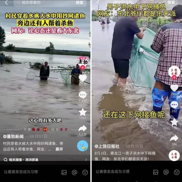 有人对比其他地区、调侃抓鱼行为,评论“咱东北能不能长点心啊,人家发水都哭,咱这显眼包在这抓上鱼了”时,一位东北网友的回复是这样的:“没有这样的心态怎么挺过冰天雪地这么多年”。