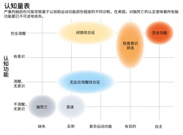严重的脑损伤可能导致基于认知和运动功能损伤程度的不同诊断。在美国,对脑死亡的认定意味着所有脑功能都已不可逆地丧失。