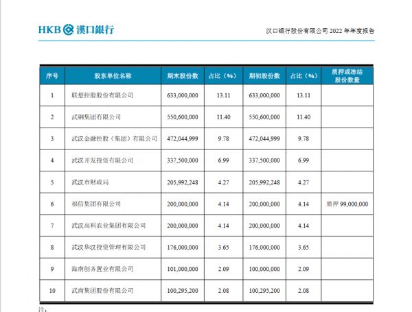 汉口银行2022年年报显示,该行前十大股东中持股超过5%的包括联想控股(持股13.11%)、武钢集团(持股11.4%)、武汉金控集团(持股9.78%)、武汉开发投资集团(持股6.99%)。