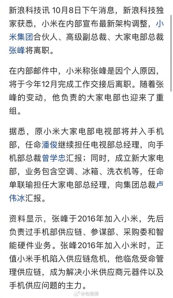 小米内部最新架构调整:小米合伙人、大家电部总裁张峰将离职……