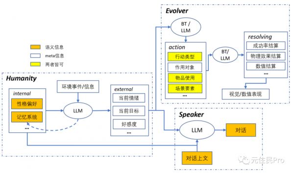 ①决策与行动:如果是 NPC,则是基于角色的 Humanity 相关描述信息,结合设计目的去执行特定行为动作;这步是否用 LLM 赋能取决于: