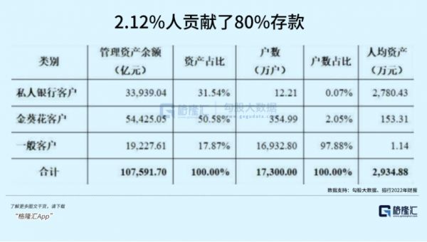 12.21万日均资产1000万元以上的富豪,持有31.54%资产,人均2780万元;355万“金葵花”客户,持有50.58%的资产,人均153万元。