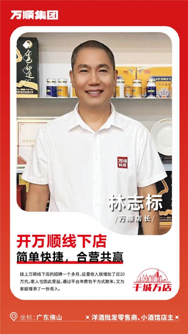 在洋酒批发零售领域摸爬滚打多年的林志标,凭借着过往丰富的商铺经营经验和商业嗅觉,第一次了解到万顺集团的“千城万店”时,马上就来了精神,在万顺集团“千城万店”开发商的指引下很快就通过了开店审核,挂上了万顺线下店的招牌,经营起了万顺的业务和产品。