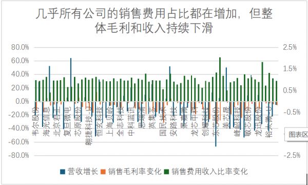 从集成电路设计行业的整体情况看,几乎所有的公司,销售费用占比都在增加,但大部分公司的营收,遭遇了大幅度的下跌。2023年上半年,集成电路设计行业同比跌去了100亿元的收入。