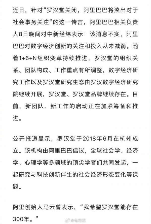 #阿里回应罗汉堂关闭传闻# 马云曾希望“存在300年”的罗汉堂关闭?阿里回应:不实,罗汉堂及品牌仍存在,阿里对数字经济创新的关注和投入从未减弱。