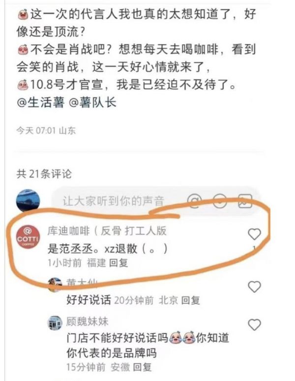 库迪咖啡近期邀请了范丞丞代言,并在10月8日正式宣布之前,放出了一张带有人物轮廓的剪影,增加神秘感,引发网友的猜测。其中一位网友猜测会不会是肖战,而一位库迪咖啡的员工则留言称是范丞丞,并写到“xz退散”。
