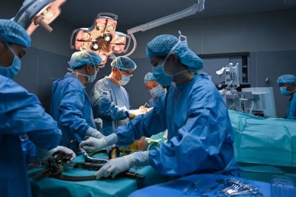孙伯民(中)正和医护团队为患者做DBS植入手术