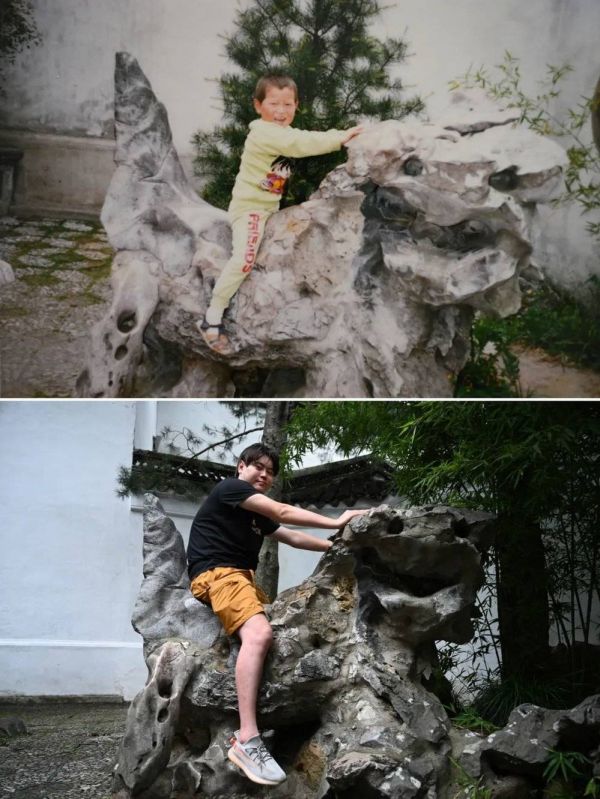 5岁时,父母带吴晓天到狮子林游玩,骑在石狮子上留影的他笑得十分开心,那时身后的松树还是一棵幼苗;2023 年,再游狮子林,石狮子依旧,吴晓天和松树都已长得十分高大