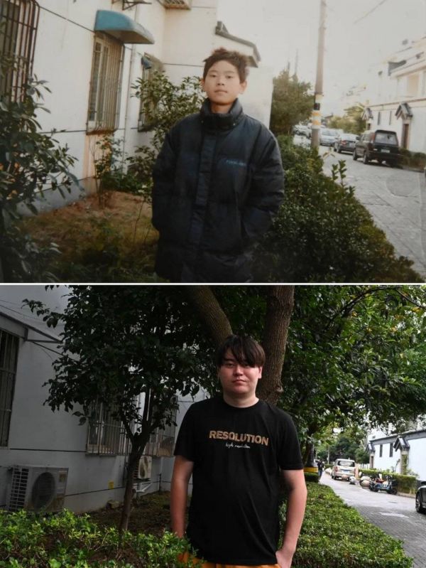 15岁的这一天,父母为了哄他开心就带着他一起在家门口拍照,照片里的他一直没有笑;十多年后(2023年),故地重游的吴晓天已经从16年的抑郁症困境中走出,这一天他笑得很努力
