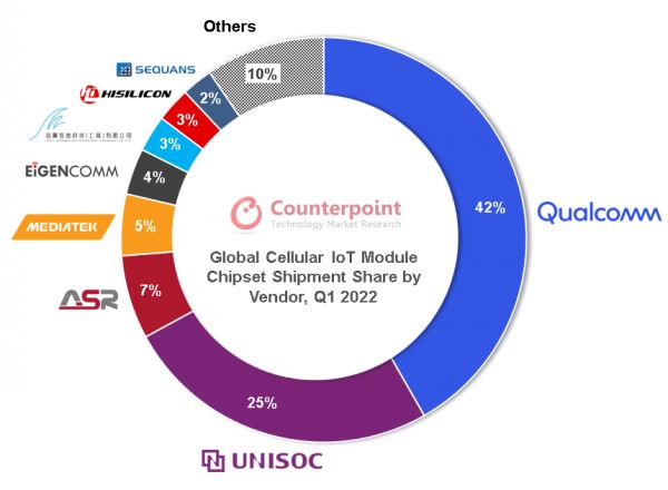 在蜂窝芯片的宽阔赛道下,众多国产蜂窝芯片企业顺势而起。根据市场研究机构Counterpoint公布的2022年Q1季度全球蜂窝IoT模组芯片厂商市场份额占比分布情况来看,高通以42%份额排名第1,紫光展锐、翱捷科技、联发科、移芯通信、芯翼信息、海思、索尼等企业也均排在前列。