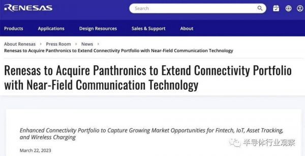 今年上半年,宣布收购Panthronics 公司。瑞萨通过此次收购,将Panthronics的NFC技术融入进自家的专有技术,让Panthronics的NFC技术全面与瑞萨的产品阵容及安全功能相结合,延展了瑞萨电子产品阵容的广度和深度。业务范围扩展到金融科技、物联网、资产跟踪、无线充电、和汽车应用中高需求的NFC应用领域,帮助瑞萨电子抓住NFC不断增长的新兴市场机遇。