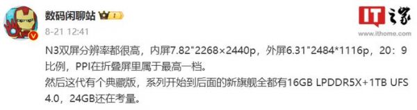 除了常规版本外,消息称 OPPO Find N3 还将推出典藏版,OPPO 后续新旗舰均提供 16GB LPDDR5X+1TB UFS 4.0,并且考虑提供 24GB 版本。
