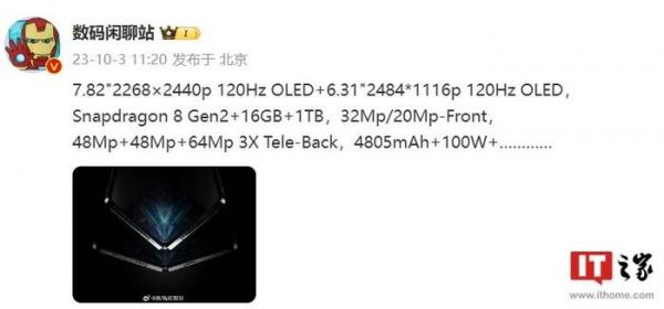 该博主透露,这款新机配备 7.82 英寸 2268*2440p OLED 内屏以及 6.31 英寸 2484*1116p OLED 外屏,内外屏均支持 120Hz 刷新率,PPI(像素密度)在折叠屏里属于“最高一档”。该机搭载骁龙 8 Gen 2 处理器,提供 16GB+1TB 大内存版本。