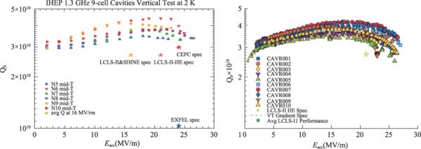 图6 高能所1.3 GHz 9-cell超导腔测试结果(左)、美国1.3 GHz 9-cell超导腔测试结果(右)