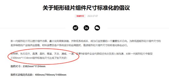 面对强力一体化趋势,通威、天合、东方日升“下海”进入硅片环节,意欲强化自身一体化趋势。加之210市场份额仍然偏小,各家企业依据行业发展的客观规律和自身利益,携手共同制定了矩形硅片组件尺寸统一倡议,并在后期的组件尺寸环节上形成一统的格局。