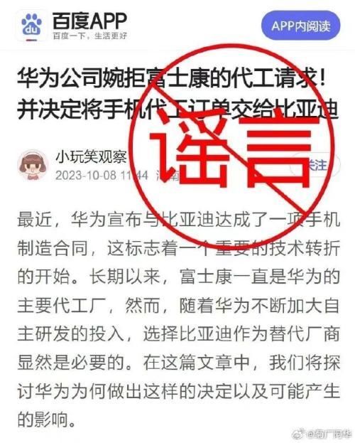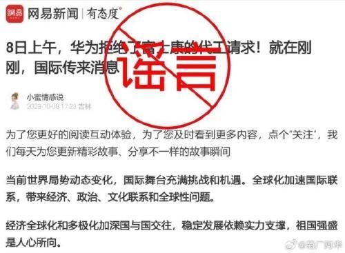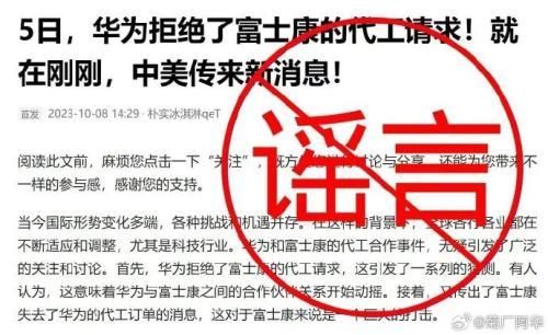 10月8日晚间,华为技术有限公司通过其官方微博“菊厂阿华”发布声明,网传“华为发布声明拒绝富士康代工请求”纯属造谣,造谣者毫无根据,无事生非,在多个平台、账号推送相同信息扩散,请勿信勿传,果断举报。