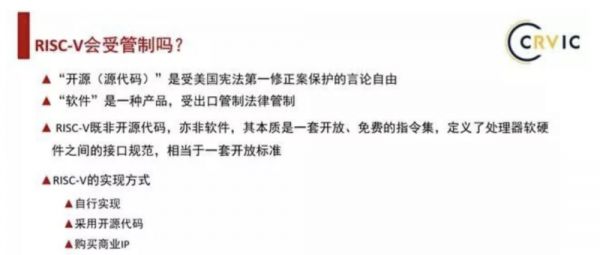 2019年5月29日,RISC-V X AIOT/5G新嵌入式智能解决方案论坛上,中国RISC-V产业联盟理事长、上海芯原微电子董事长戴伟民表示,RISC-V本身开源不受限制。“开源”受美国宪法第一修正案保护的言论自由,“软件”则会受到监管,而RSIC-V并非二者,而是一套开放的、免费的指令集,因此不会受到美国出口管制禁令影响。