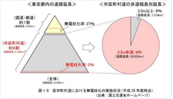 就连日本最繁荣的两个大都市,电缆地下率也少得可怜。东京都23区只有8%,大阪市只有6%而已。