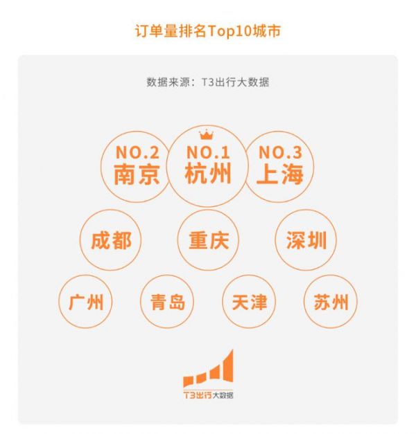 从T3出行用户出行订单分布数据来看,出行订单量Top10城市分别为杭州、南京、上海、成都、重庆、深圳、广州、青岛、天津、苏州。出行订单量同比增速排名Top10城市分别为上海、柳州、杭州、天津、贵阳、海口、南宁、哈尔滨、佛山、三亚。