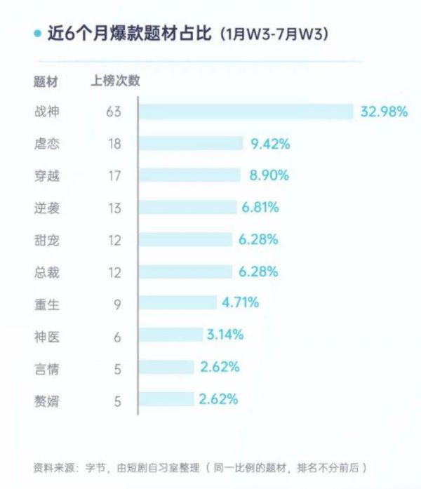 另一边,在去年异军突起的竖屏“小程序短剧”主要瞄准30岁~55岁的下沉市场的男性、中老年用户,题材以逆袭爽剧为主。根据短剧自习室整理的数据,在2023年1月~6月的爆款微短剧里,90%的题材仍然以“爽”为主,如战神、穿越、逆袭、重生等。