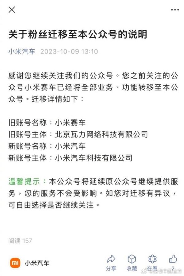 10月9日消息,据IT之家媒体报道,“小米赛车”游戏的公众号已于今日变更为“小米汽车”,主体也变成了小米汽车科技有限公司。众所周知,《小米赛车》是一款竞速类赛车游戏,于 2019 年开启公测,不过目前官网已无法正常访问。此外,小爱同学透露,用户可以通过手机的小米汽车 App 绑定车辆,支持远程控车。