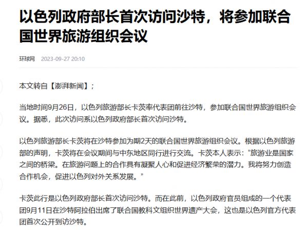 尤其是在我国帮助沙特和伊朗关系正常化之后,沙特和以色列的关系正常化成为美国非常热心的项目。在9月26日,以色列旅游部长甚至历史性的率领官方代表团在沙特参加联合国世界旅游组织活动。另外在两天前,以色列环境部长宣布将在下周参加于沙特举办的气候会议。
