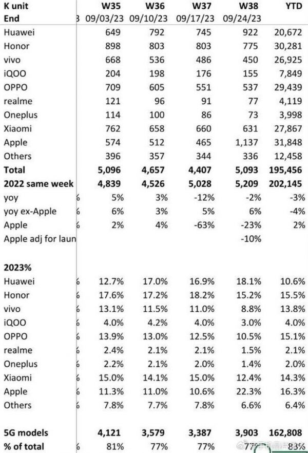 根据行业人士给出的国内9月手机销售数据显示,凭借着iPhone 15系列的发布,苹果在第38周占据国内市场22.3%,荣登排名第一,第二名则是华为,市场份额上升到了18.1%,在国产手机领域重登第一宝座。