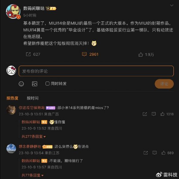 恰巧,就在近日知名爆料博主@数码闲聊站表示,MIUI 14是MIUI的收官之作,之后不会再更新任何大版本,至于原因想必大家也能猜到,小米真的要发布自己的操作系统了。