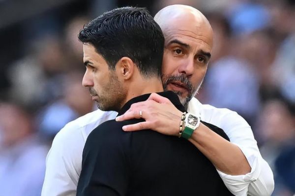 当马丁内利破门的一瞬间,阿尔特塔非常激动,握拳怒吼庆祝,还跟助手相拥,另一边的瓜迪奥拉摸了一下头,也是十分无奈。
