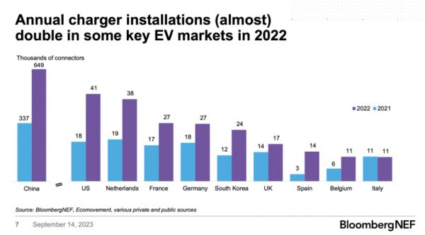 在9月26~27日于荷兰乌特勒支(Utrecht)召开的欧洲电动车大会(AEC 2023)中,彭博新能源财经展示了一组关键数据:2022年全年,中国安装了80万个充电桩,几乎与全球其他地方安装的总数一样多。
