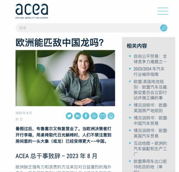 在ACEA网站8月31日刊登的文章《欧洲能匹敌中国龙吗?》的开头,作者AECA总干事西格丽德·德弗里斯用调侃的语气说,“当欧洲决策者打开行李箱,用桌椅取代日光躺椅时”,中国已经变得更强大。