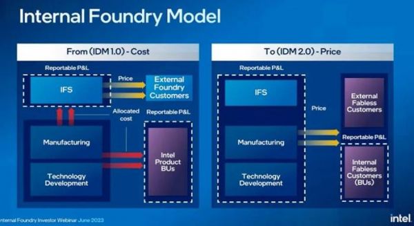 IFS的独立发展,其实也早就被英特尔提上日程。今年6月,英特尔宣布进行架构重组,IFS将独立运营、单独结算,并以第三方代工厂的形式继续和英特尔其他业务部门展开合作。
