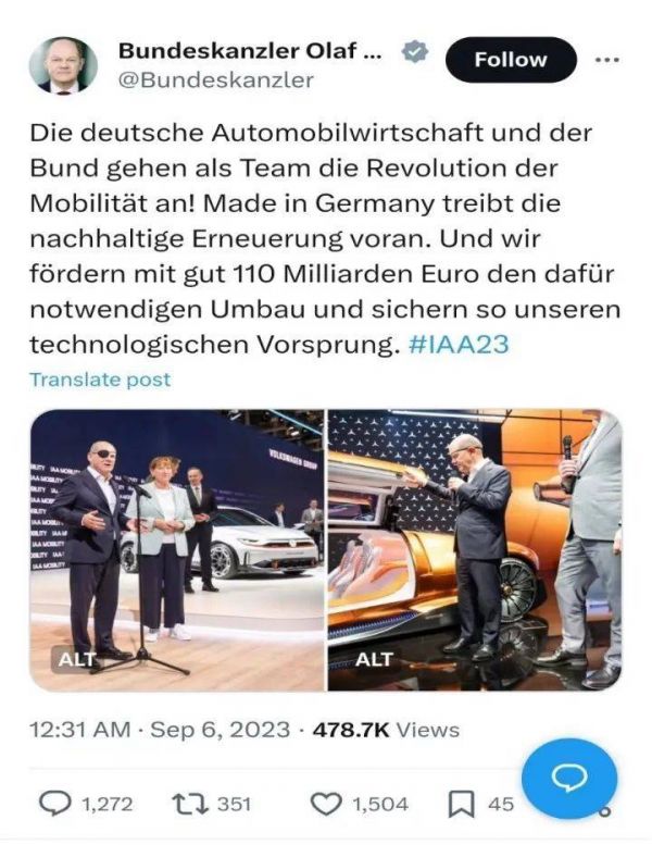 朔尔茨在慕尼黑车展期间发布推特,表示德国联邦政府与汽车界将并肩努力,德国将投入1100亿欧元助推德国车企的电动化转型。