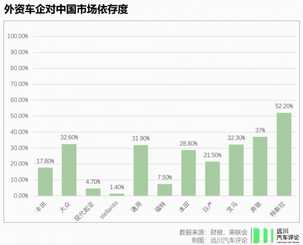 反而作为第一辆现代意义电动汽车EV1发明者的通用,已经从此前的全球车企TOP3滑落至全球第五大车企,他们很难完成这样的战略重心转移。一部分原因在于,通用对中国市场的依赖度达到31.9%,在外资品牌中仅次于大众。