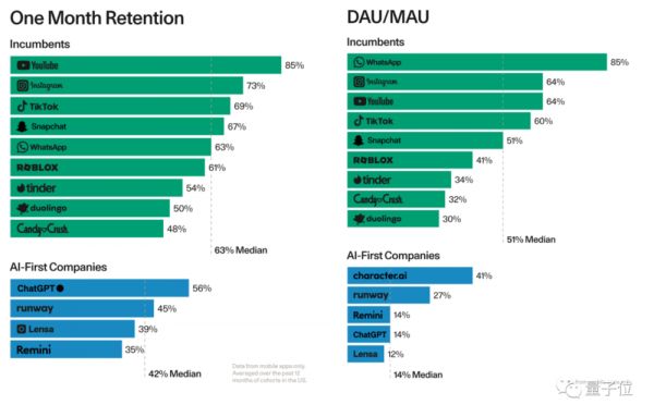 红杉资本《Generative AI’s Act Two》中就提到,无论是首月用户留存率,还是目前用户的日常使用情况,相比其他的产品,大模型为代表的生成式AI使用情况都不容乐观。
